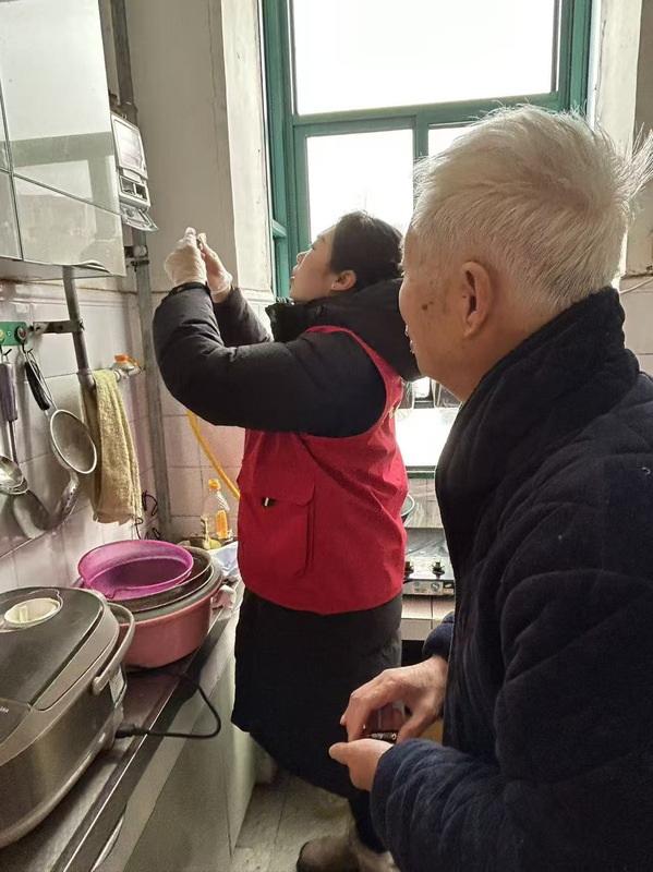 抢修工作刚收尾,网格员张玲、代静、宗静便拿着独居老人登记册,深一脚浅一脚地穿梭在小区楼栋间。敲开87岁独居老人袁老师的家门时,老人正对着冰冷的灶台犯愁。“袁老师,我们来帮您通燃气啦!”代静笑着脱下外套,俯身仔细检查燃气阀门,一步步耐心操作演示,宗静则在一旁柔声讲解安全注意事项。“您看,先打开总阀,再按一下燃气表的复位键,听到提示音就好啦。”看着蓝色的火苗在灶上欢快燃起,袁老师紧紧拉着她们的手,眼眶微微泛红:“真是比亲人还周到,这么冷的雪天,还麻烦你们特地跑一趟。”