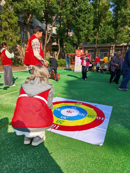 趣味运动区无疑是全场的焦点。这里既有考验平衡与耐心的“运送乒乓球”,也有需要精准技巧的“投沙包”、“投壶”和“桌上冰壶”,老朋友们瞄准、出手,场边欢呼声与掌声此起彼伏。而“赶’鸡’入笼”、“夹纸运纸大作战”等项目则充满了童真童趣,让老人们仿佛回到了童年。最受欢迎的当属“果蔬圈圈乐”,套中的蔬菜可以直接带回家,让参与者收获了双倍的喜悦。整个赛场上,没有紧张的竞技比拼,只有相互的鼓劲、默契的配合和洋溢在每个人脸上的开心笑容。