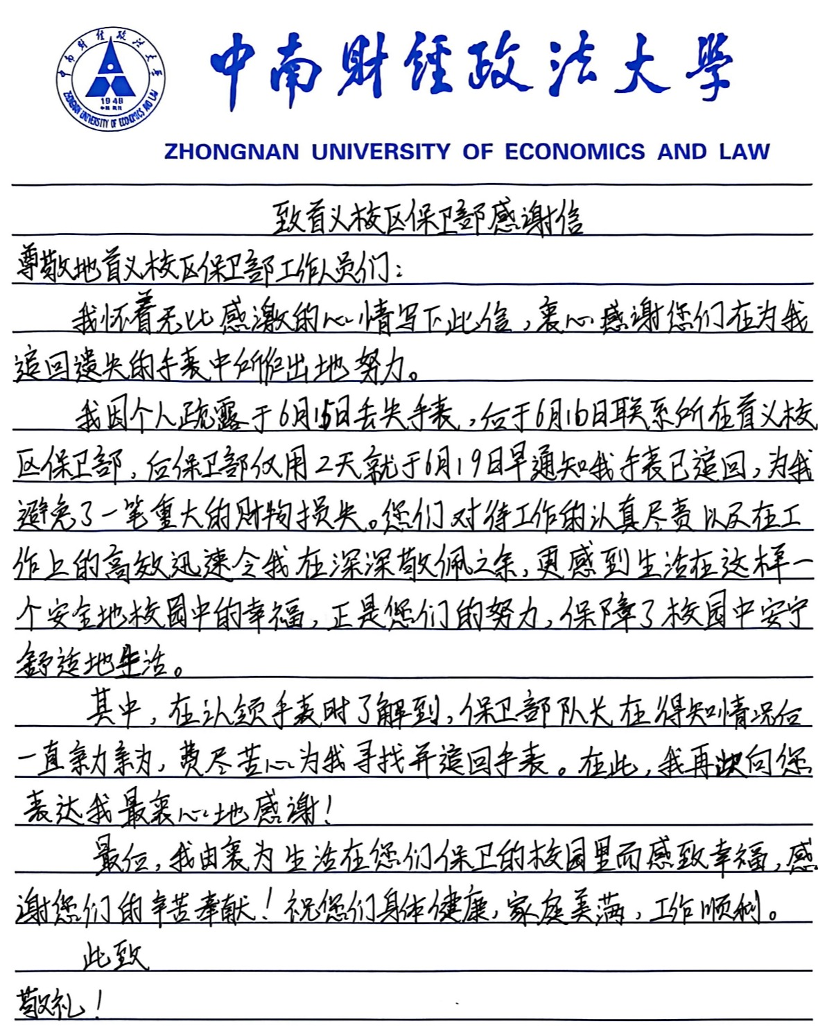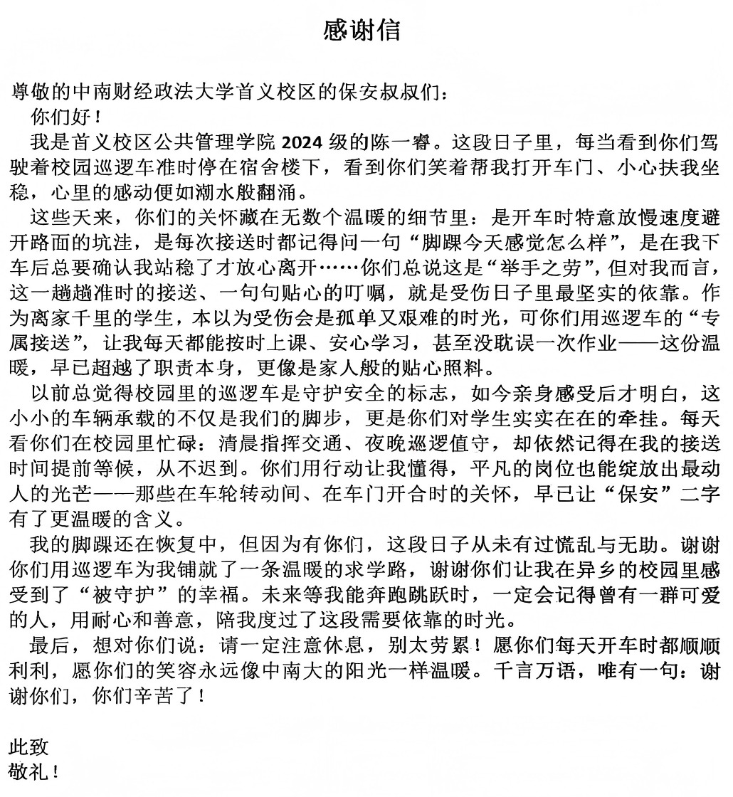 今年以来,保卫部已累计回应各类求助1627起,包括接送伤病学生上下课、就医、寻回遗失物品、为离退休教职工提供上门服务等,涌现出许多暖心瞬间,部门多次收到师生赠送的锦旗与感谢信。