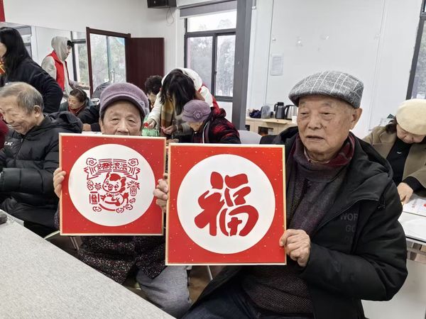 趣味互动环节精彩纷呈。在“经典歌曲猜唱”中,熟悉的旋律响起,长者们踊跃举手、即兴跟唱,深情合唱声回荡全场;“emoji成语古诗竞猜”则以生动新颖的形式激发大家的想象力,欢声笑语不断;“福字拓印”手工环节中,在志愿者协助下,长者们专注地在挂历上拓印出一幅幅满载吉祥寓意的“福”字,表达对新年的美好期待。